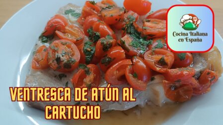 Coloca los dos cartuchos sobre una bandeja y hornea durante 15 minutos. El atún quedará tierno y jugoso, impregnado con el aroma de los ingredientes. - Servir: